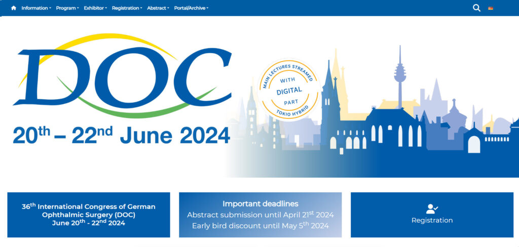 The 36th International Congress of German Ophthalmic Surgery (DOC) will be held in Nuremberg, Germany, from June 20th to 22nd 2024. Leading experts will present innovations and advancements and discuss the gold standards of ophthalmic surgery with the auditorium. Practical ophthalmic surgery is given a lot of emphasis in wetlabs and courses, ensuring comprehensive, hands-on training and continued education.